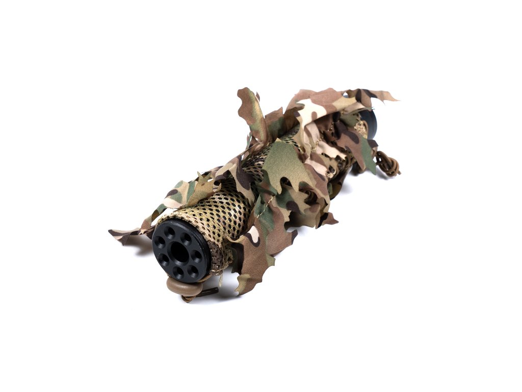 Chcete zamezit odhalení kvůli lesklému pravidelnému tvaru tlumiče? Hledáte rychlé a funkční maskování pro odstřelovače, které zlepší krytí vaší pušky? Potřebujete potah s 3D listy, který rozbije kontury a splyne s okolím? Tento univerzální maskovací potah byl barevně laděn vojenskými experty z Vídně, aby spolehlivě fungoval v reálných podmínkách. Díky nízko-profilovému tubusovému provedení jej snadno přizpůsobíte pro většinu tlumičů o délce 160 a 220 mm a průměru do 40 mm (včetně). Potah neomezuje výhled optiky, nezatěžuje zbraň, je bezhlučný a lze jej doplnit o další maskovací prvky Novritsch Leaf Camo System nebo ANAREUS SilkLeaf či SilkGrass pro dokonalý efekt. Dimenzován je pro tlumič Novritsch Rifle Mock Suppressor (220x40 mm) nebo modulární tlumič V1 (až 225x38 mm), ale díky možnosti narolování potahu k sobě jej instalujete i na kratší tlumiče jiných výrobců jako FMA, 5KU či Angry Gun.