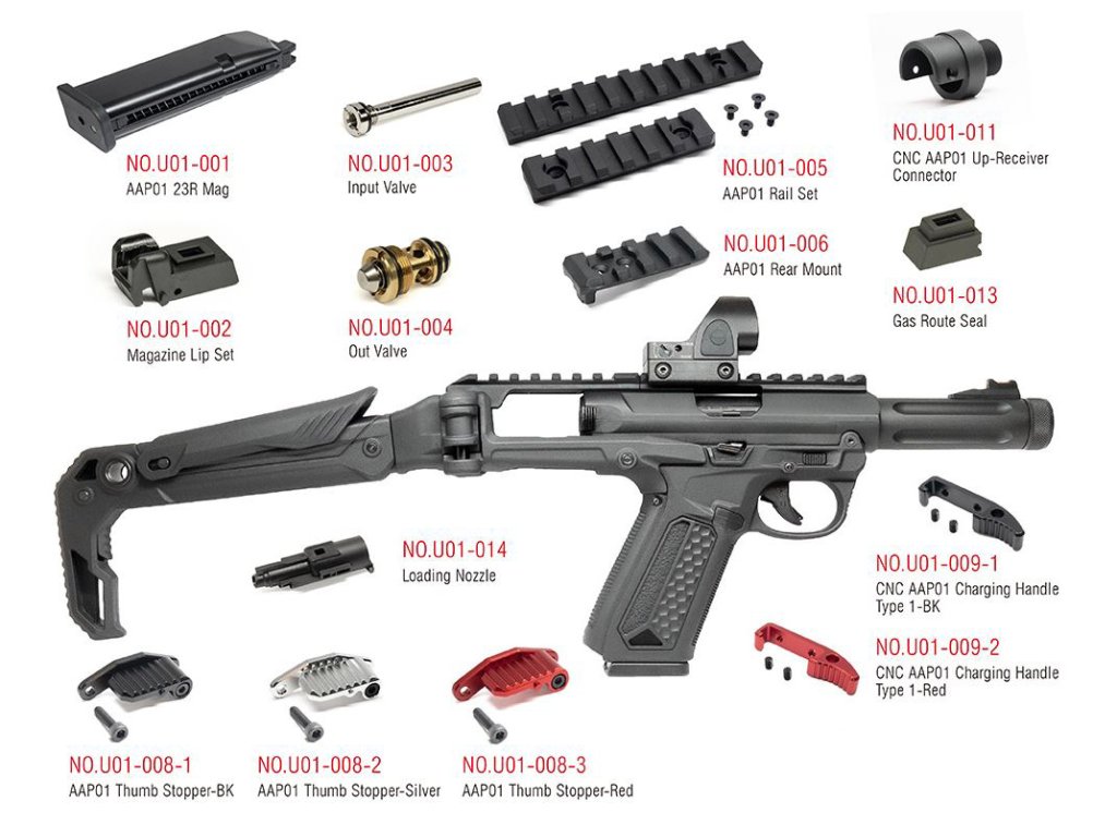 Unikátní konstrukce kombinuje pevný polymerový rám s kovovými vnitřními díly a přináší tak ideální rovnováhu mezi odolností a nízkou hmotností. Díky své kompatibilitě se zásobníky řady G-series (TM, WE, VORSK, Raven, Novritsch) a bohaté podpoře doplňků od výrobců jako CTM TAC, Hadron Airsoft nebo CowCow se z AAP-01 stává modulární platforma, která se vám nikdy neomrzí.V základu získáte všestrannou GBB pistoli s regulovatelným hop-upem, světlovodnými mířidly a režimy střelby semi / full-auto. Ale během pár minut z ní můžete udělat ultimátní CQB samopal, připojit HPA konverzi nebo si postavit taktický long-range DMR build. Na vnější hlavni najdete levotočivý 14mm závit (CCW) pro montáž běžně dostupných tlumičů nebo nasvětlovacích Tracer jednotek. Závit je chráněn krytkou závitu, který zakončuje vnější hlave..