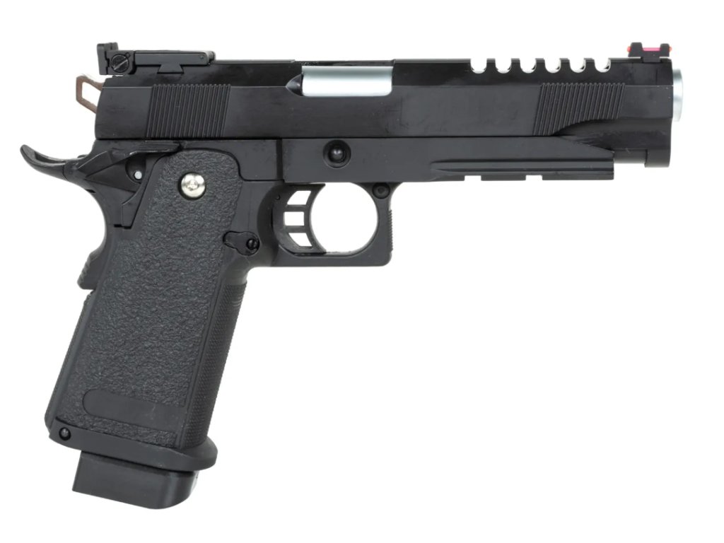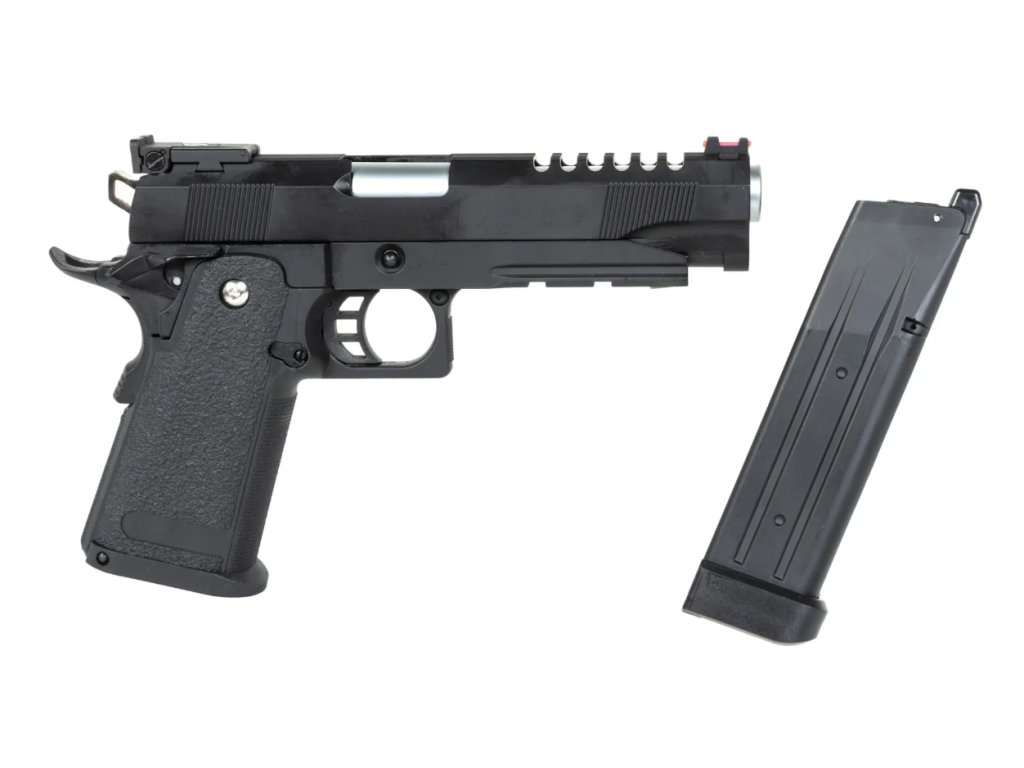 Airsoftová pistole E&C EC-2104 je poháněná green gasem a kombinuje kovové a polymerové díly. Kovový závěr má na zadní části drážkování, které nejen dodává zajímavý vzhled, ale zároveň odlehčuje celou konstrukci. Povrch závěru je zdrsněný, což usnadňuje natahování i v náročných podmínkách. Hlaveň je vybavena jednoduchým, ale účinným systémem nastavení hop-upu (nahoru/dolů).