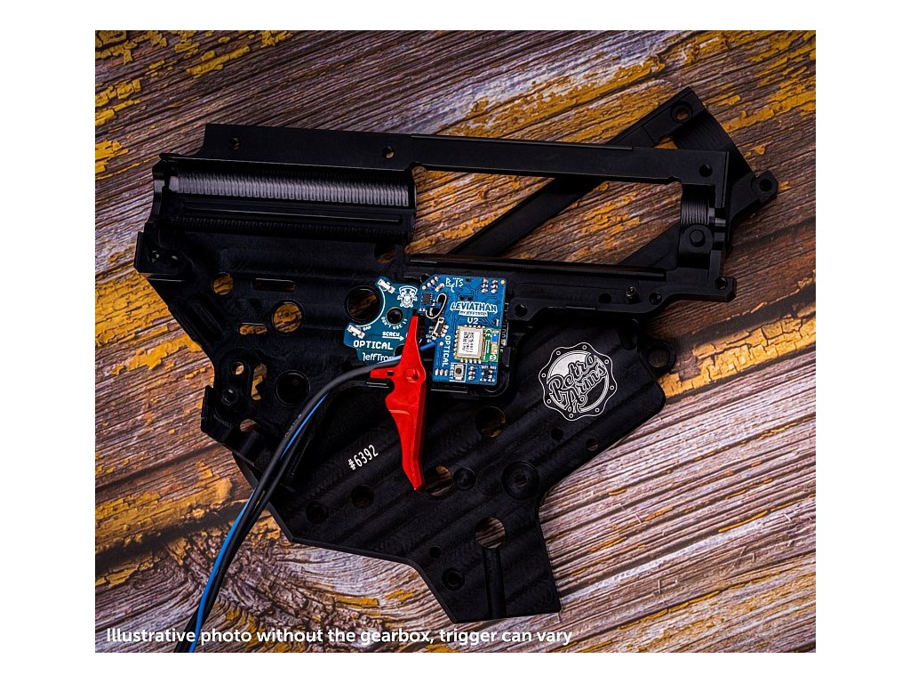 Leviathan V2 Optical je elektronická ETU jednotka s Bluetooth, která je navržená pro instalaci do mechaboxu V2 a V2.5 podle TM standardu. Díky optickým senzorům pro detekci výstřelu a přepínače režimu střelby a extrémně krátkému spínači (pouhých 0,13 mm) umožňuje nastavit reálný hair trigger mód. Systém Real Feel Trigger System (RFTS) s pružinou simuluje odpor spouště reálné zbraně a přidává reset po výstřelu. Pomocí aplikace JeffTron můžete v reálném čase konfigurovat režimy střelby, kadenci, aktivní brzdu, před-natažení pístu, virtuální zásobník a mnoho dalšího. Vstupní i výstupní port podporují připojení externích doplňků jako jsou svítilny, elektrické zásobníky nebo senzor prázdného zásobníku. Jednotka je chráněna konformním lakem. Je kompatibilní s vysokokadenčními sestavami včetně DSG kol a je plně připravena pro Brushless motory jako Warhead. Všechny změny provedené v aplikaci se ukládají v reálném čase do paměti jednotky. Navíc k této jednotce dostanete i CNC hliníkovou spoušť od Retro Arms, která má šroub pro nastavení výchozí pozice a stylový vzhled.
