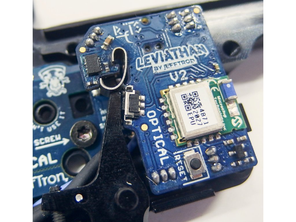 Leviathan V2 Optical je elektronická ETU jednotka s Bluetooth, která je navržená pro instalaci do mechaboxu V2 a V2.5 podle TM standardu. Díky optickým senzorům pro detekci výstřelu a přepínače režimu střelby a extrémně krátkému spínači (pouhých 0,13 mm) umožňuje nastavit reálný hair trigger mód. Systém Real Feel Trigger System (RFTS) s pružinou simuluje odpor spouště reálné zbraně a přidává reset po výstřelu. Pomocí aplikace JeffTron můžete v reálném čase konfigurovat režimy střelby, kadenci, aktivní brzdu, před-natažení pístu, virtuální zásobník a mnoho dalšího. Vstupní i výstupní port podporují připojení externích doplňků jako jsou svítilny, elektrické zásobníky nebo senzor prázdného zásobníku. Jednotka je chráněna konformním lakem. Je kompatibilní s vysokokadenčními sestavami včetně DSG kol a je plně připravena pro Brushless motory jako Warhead. Všechny změny provedené v aplikaci se ukládají v reálném čase do paměti jednotky. Navíc k této jednotce dostanete i CNC hliníkovou spoušť od Retro Arms, která má šroub pro nastavení výchozí pozice a stylový vzhled.