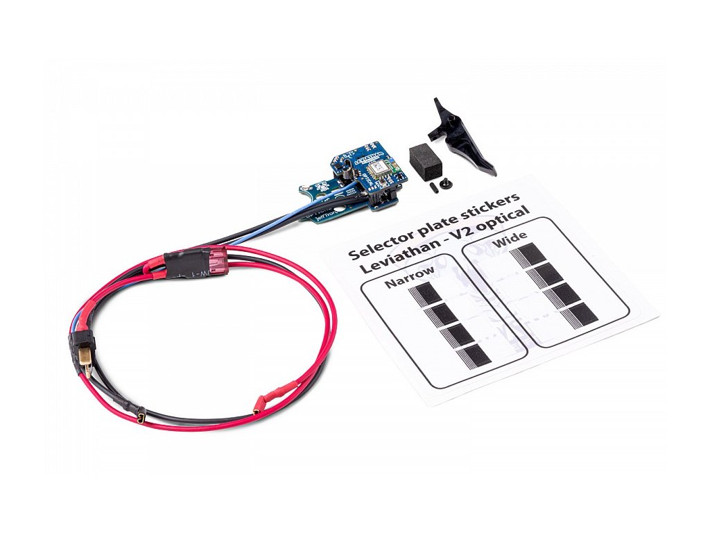 Leviathan V2 Optical je elektronická ETU jednotka s Bluetooth, která je navržená pro instalaci do mechaboxu V2 a V2.5 podle TM standardu. Díky optickým senzorům pro detekci výstřelu a přepínače režimu střelby a extrémně krátkému spínači (pouhých 0,13 mm) umožňuje nastavit reálný hair trigger mód. Systém Real Feel Trigger System (RFTS) s pružinou simuluje odpor spouště reálné zbraně a přidává reset po výstřelu. Pomocí aplikace JeffTron můžete v reálném čase konfigurovat režimy střelby, kadenci, aktivní brzdu, před-natažení pístu, virtuální zásobník a mnoho dalšího. Vstupní i výstupní port podporují připojení externích doplňků jako jsou svítilny, elektrické zásobníky nebo senzor prázdného zásobníku. Jednotka je chráněna konformním lakem. Je kompatibilní s vysokokadenčními sestavami včetně DSG kol a je plně připravena pro Brushless motory jako Warhead. Všechny změny provedené v aplikaci se ukládají v reálném čase do paměti jednotky. Navíc k této jednotce dostanete i CNC hliníkovou spoušť od Retro Arms, která má šroub pro nastavení výchozí pozice a stylový vzhled.