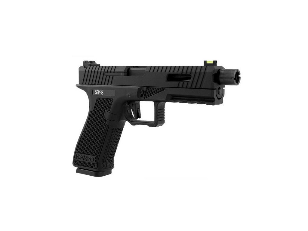 Nemůže si vybrat ten pravý Glock? Chcete výkonnou plynovou pistoli s vysokou kadencí a spolehlivostí? Máte rádi unikátní design, co nemá každý druhý hráč? Poté jste našli vaši novou vyvolenou pistoli. SSP18 je totiž plynová pistole, která střílí jednotlivě nebo dávkou s kadencí až 17 RPS. Je postavena na platformě G-Series 18C (Glock 18C) a přináší dokonalou přesnost díky fixní vnější hlavni FXB. Ta v sobě ukrývá 6,01mm přesnou vnitřní hlaveň a CNC hop-up komoru, která nahopuje i těžší BBs o váze 0,32 g. SSP18 je pro hráče, kteří hledají kadenci, přesnost a odolnost v jednom. Třešničkou na dortu této povedené repliky SSP18 jsou kompletně ocelové díly spoušťového mechanismu, které jsou stavěny i pro použití s CO2 nebo HPA (při nastavení výkonu 1 Joule) a nabízí špičkovou odolnost a kluznost.Rám pistole je vyroben z kvalitního polymeru a je osazen hliníkovým CNC závěrem. Díky závitu 14mm CCW můžete osadit pistoli nasvětlovací Tracer jednotkou nebo tlumičem. Na rámu najdete také RIS lištu pro příslušenství. Pistoli samozřejmě můžete nosit v běžných pouzdrech pro pistole Glock (G17). Z pistole SSP18 můžete také vytvořit malý samopal, stačí si dokoupit karabinový kit pro SSP18.