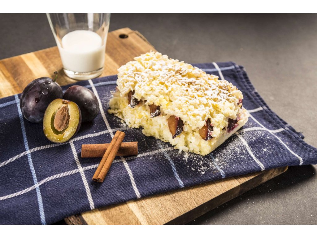 mléko kravské, rýže dlouhozrnná, švestky kompotované (švestky, voda, cukr, kyselina citronová), vejce, cukr řepný, máslo, sůl, skořice.