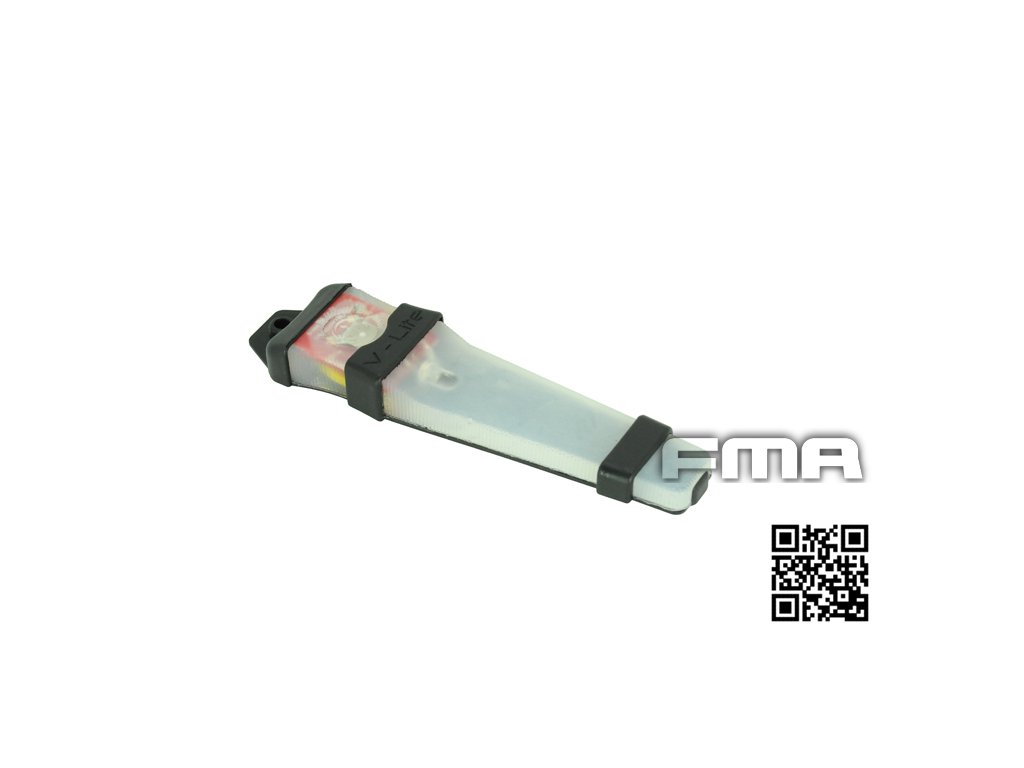FMA světlo V-LITE (dříve známé jako E-LITE) je vyvinuté pro identifikaci a označení osob v nočním prostředí pomocí systému AIMD (Advanced Identification Marking Module). Díky plochému a flexibilnímu silikonovému tělu je možné světlo snadno připevnit na zakřivený profil (například helmy, oděv či výstroj), aniž by světlo omezovalo v pohybu.Tento design také snižuje riziko poranění, což zvyšuje bezpečnost uživatele například při seskoku s padákem. Světlo lze jednoduše připevnit na VELCRO panel přilby, vesty, košile, batohu, nebo jej provléknout do MOLLE vazby. Součástí balení je šňůrka pro zavěšení za krk nebo uvázání k výstroji či stanu.V-LITE nabízí 2 funkce, a to režim stálého svícení nebo blikání, což zajišťuje viditelnost v různých světelných podmínkách. Dále je světlo odolné vůči vodě a nárazům, takže je ideální pro použití u bezpečnostních složek, potápění nebo na airsoftu.Napájeno je pomocí vestavěné CR2032 baterie, která poskytuje 120 hodin nepřetržitého provozu. Baterie je zatavená ve vodotěsném pouzdře a připájena přímo k základní desce, tudíž nejde vyměnit ani za cenu porušení silikonového obalu.